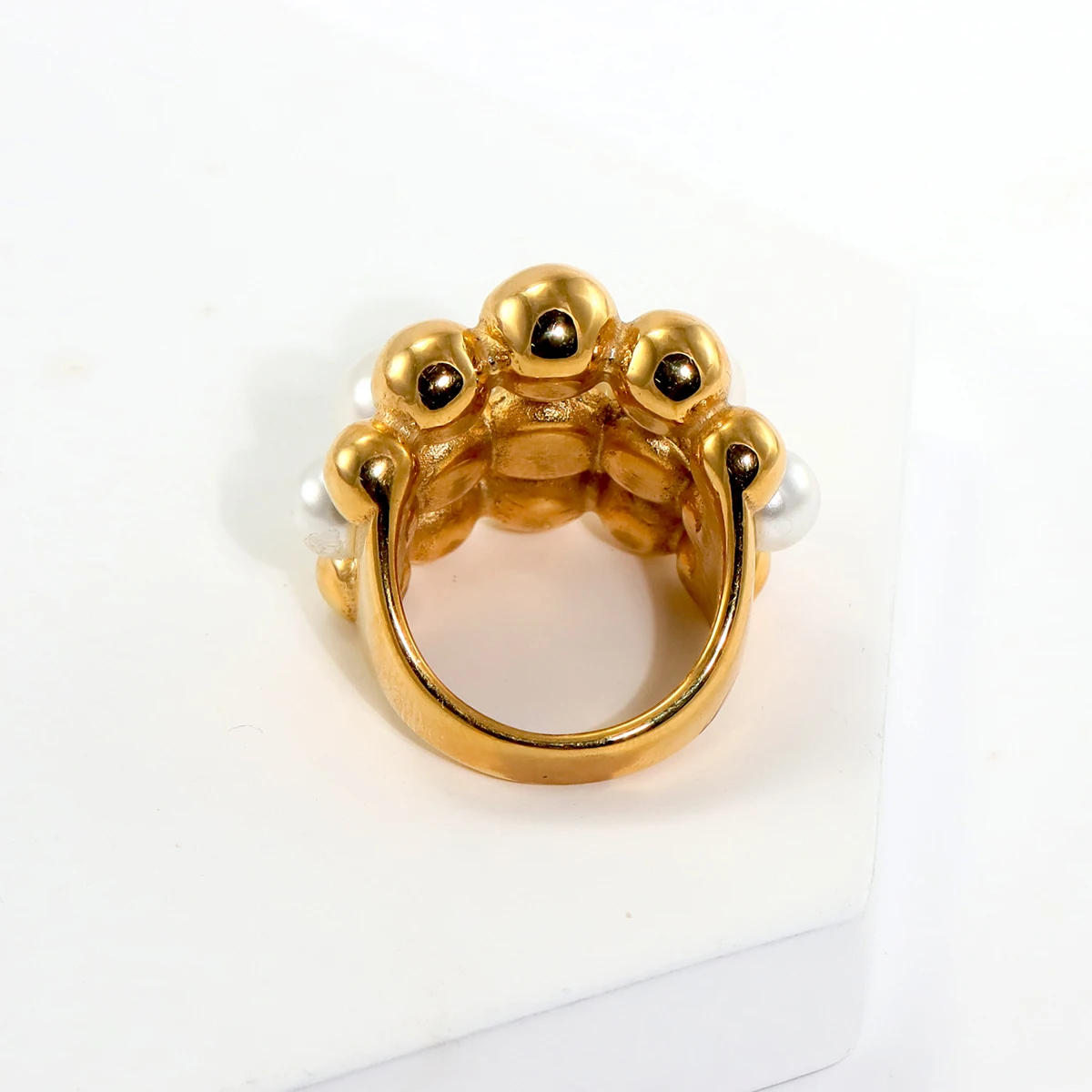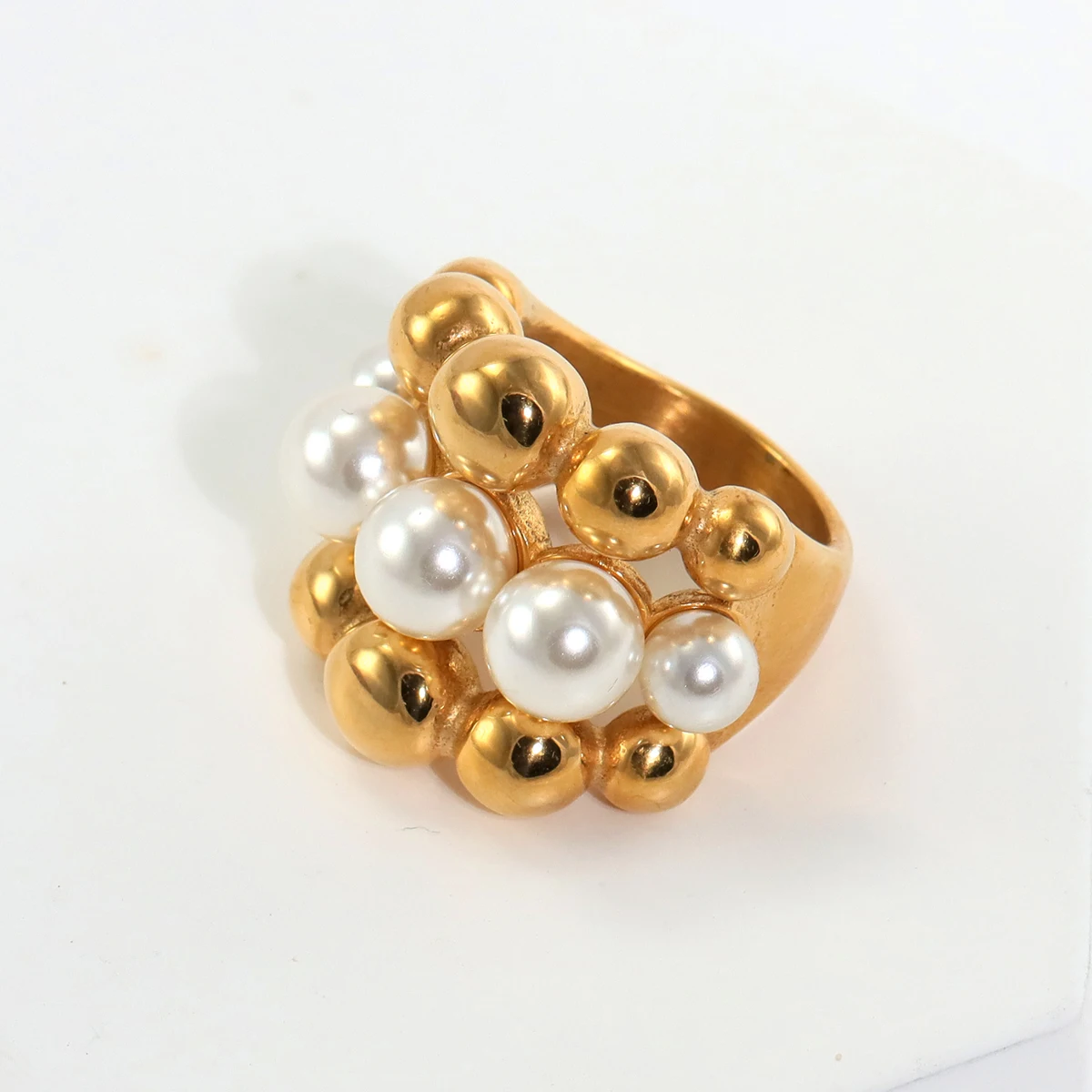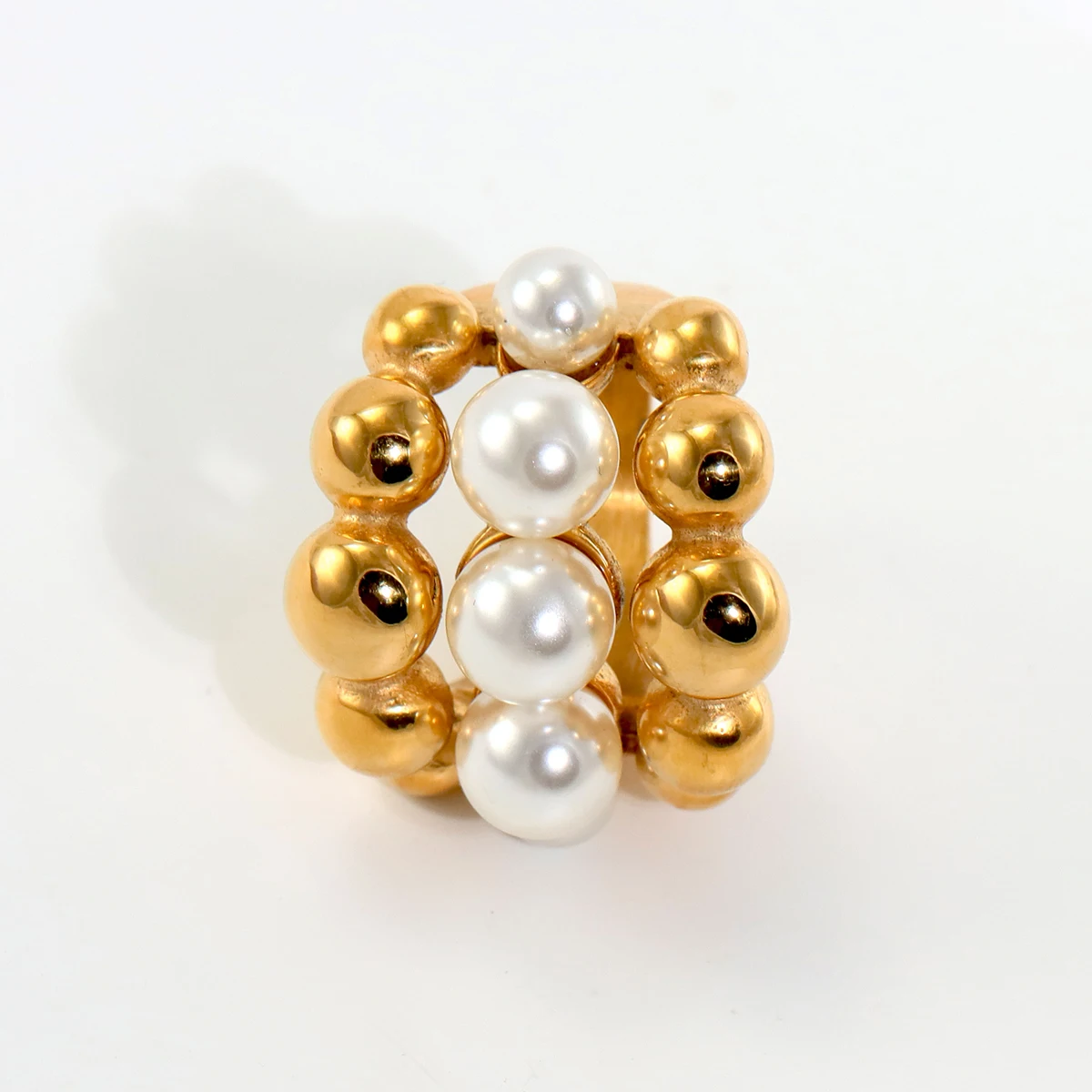 Bague à multiples perles blanches et dorées
