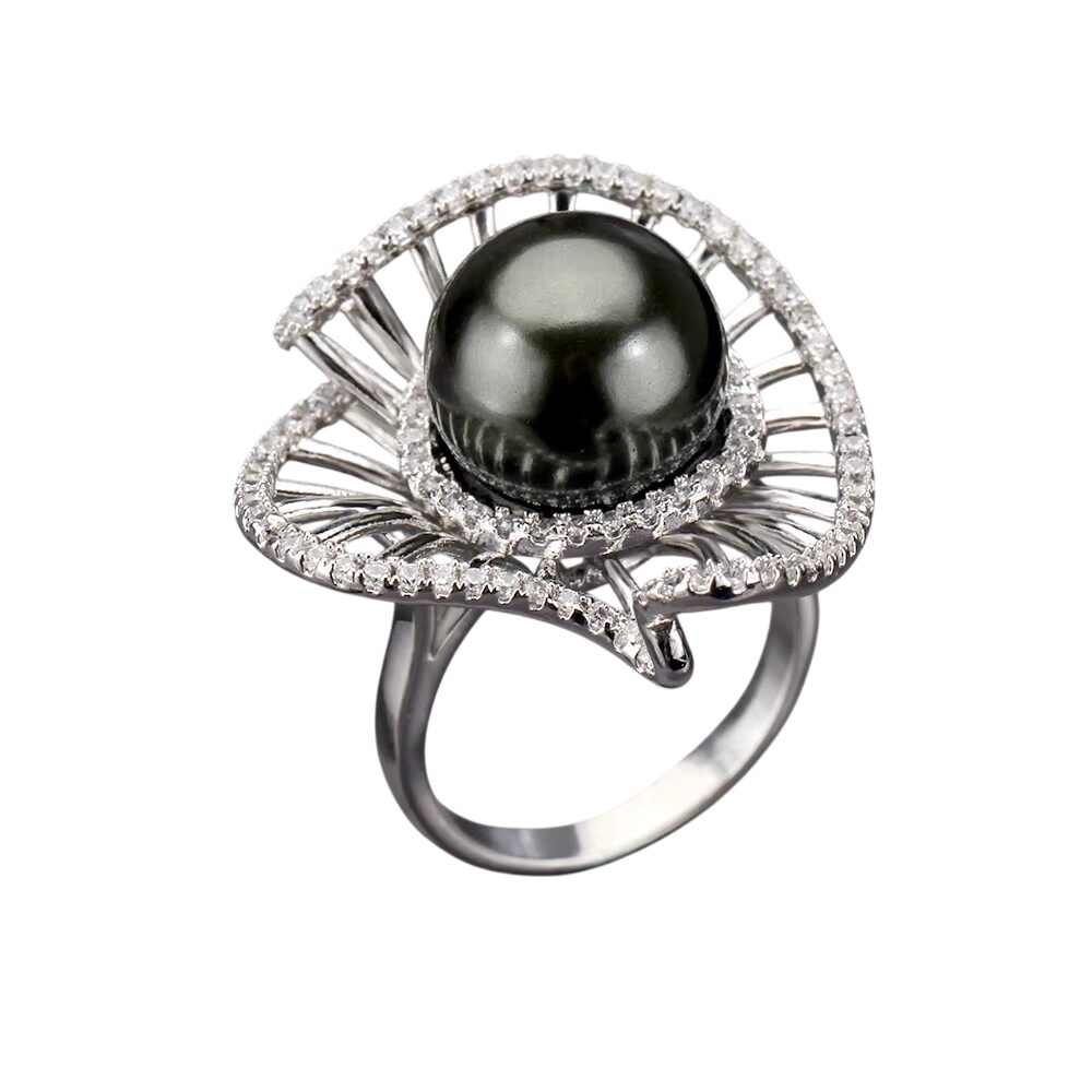 Bague fleur argentée avec perle noire