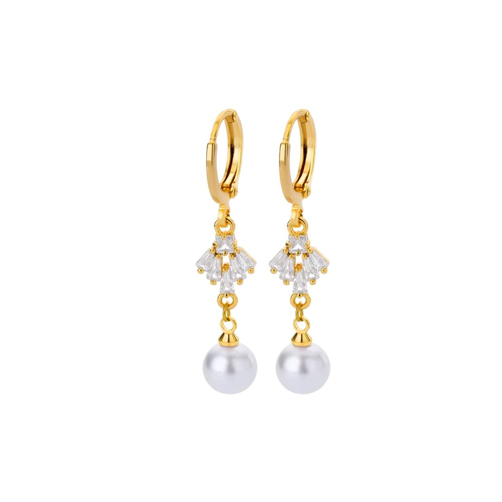 Boucles d’oreilles design dorées avec cristaux et perles blanches