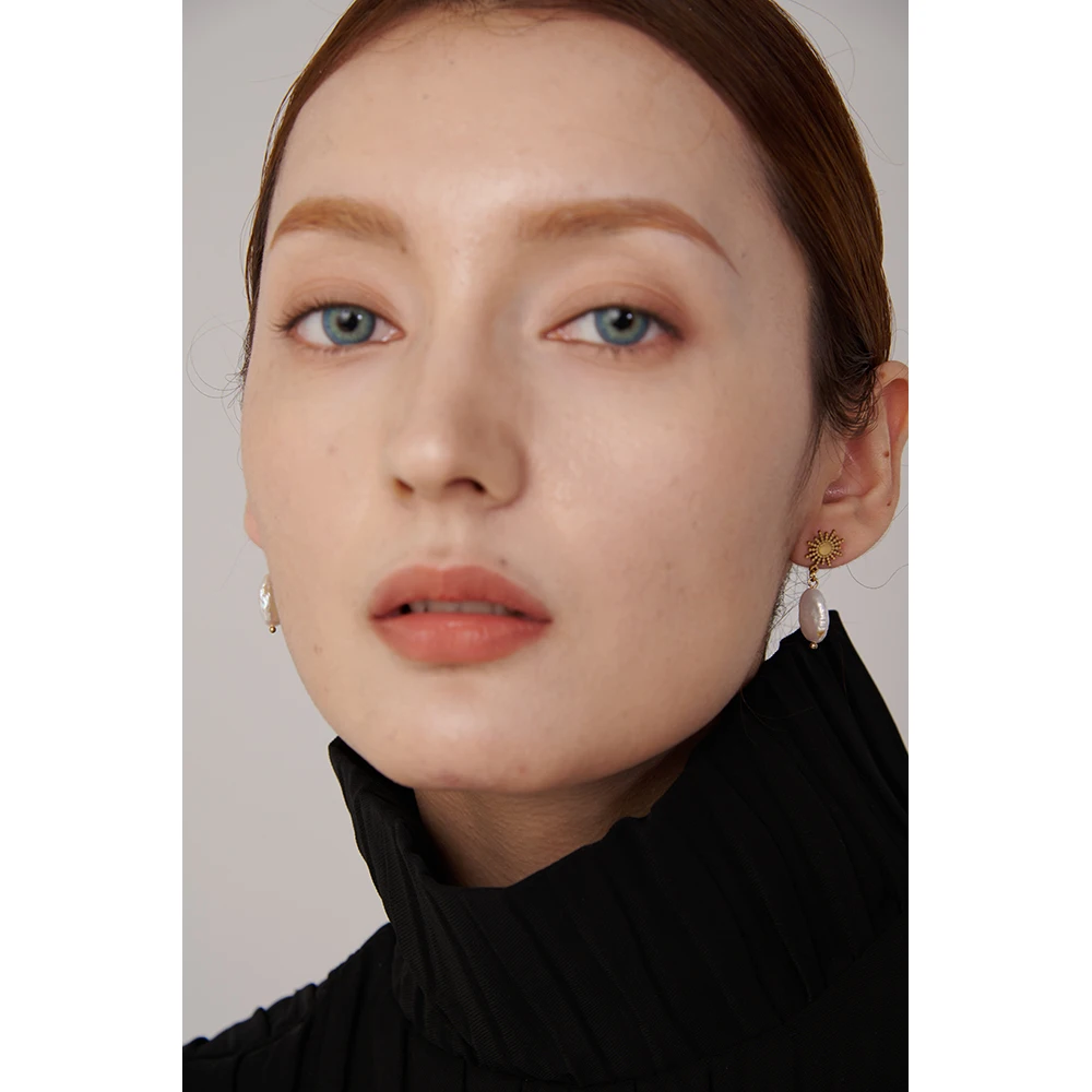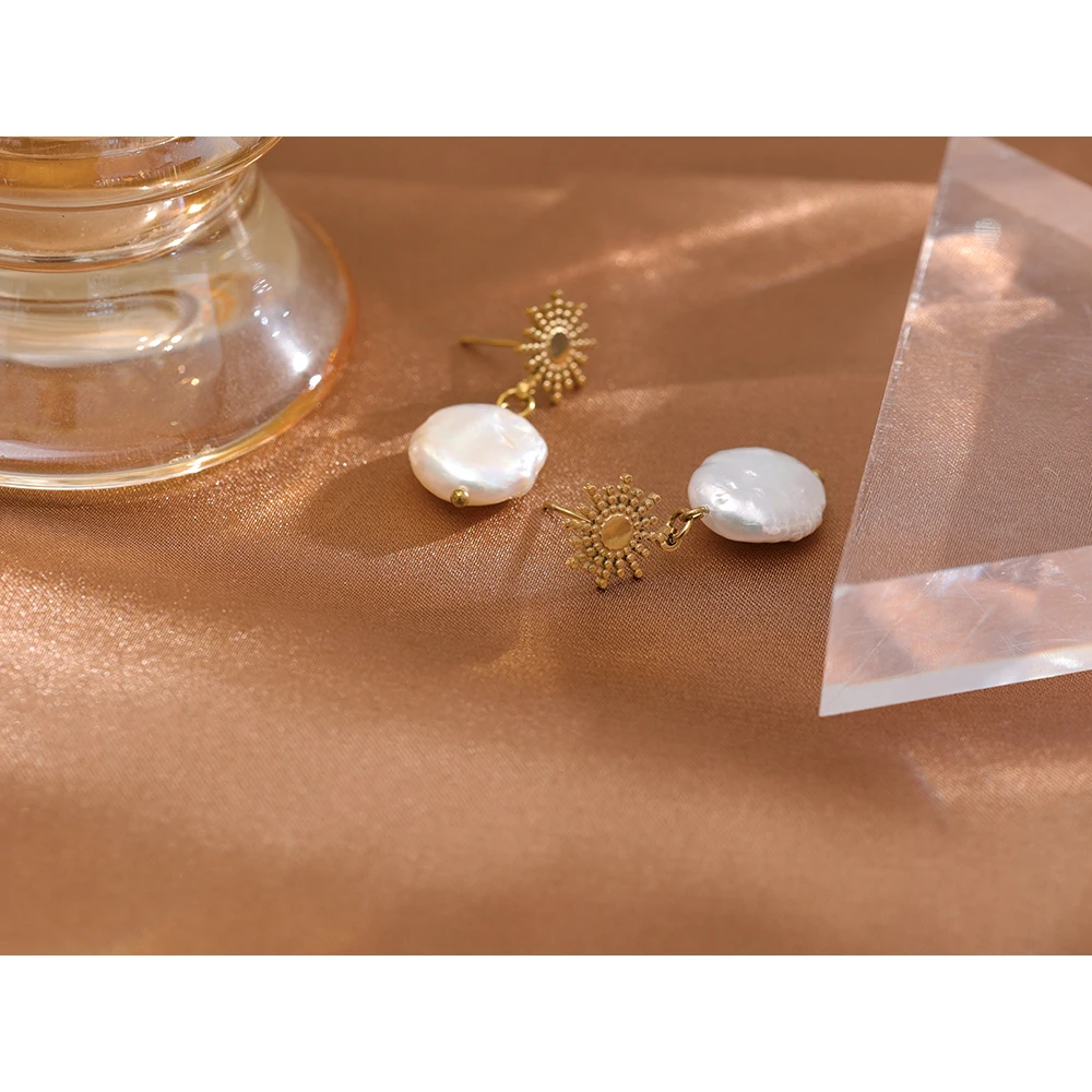 Boucles d’oreilles perles plates blanches avec soleils dorés