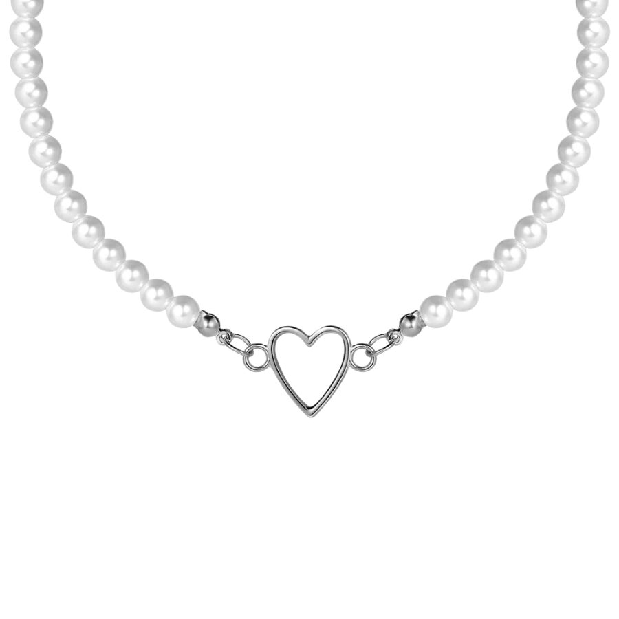 Collier orné de perle près du cou avec pendentif cœur fantaisie argent