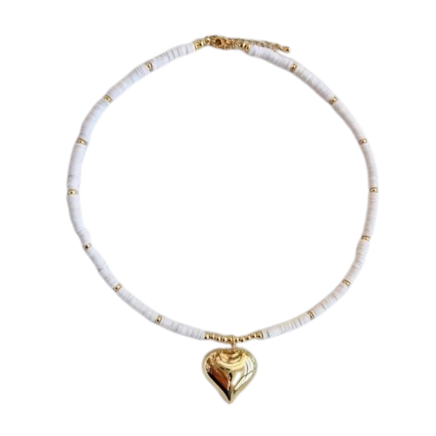 Collier perles Heishi naturelles blanc et doré avec pendentif coeur