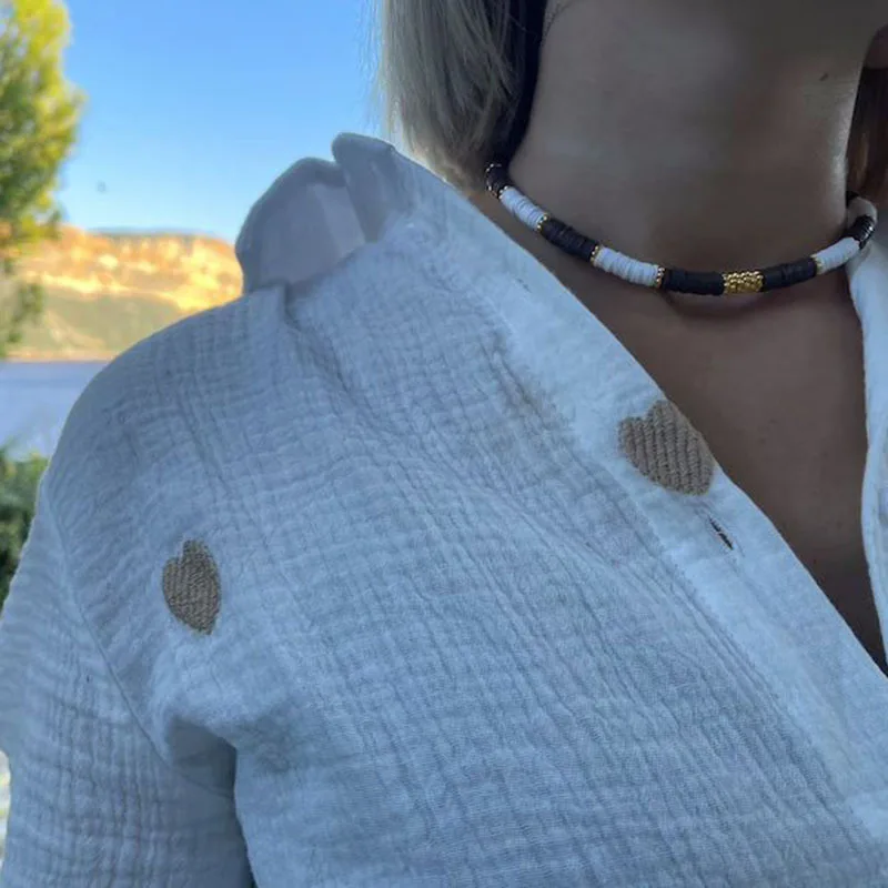 Le collier perles Heishi ras de cou blanc et noir est l’accessoire parfait pour donner une touche d’originalité à votre tenue. Avec ses perles plates en céramique, ce collier se distingue par son alternance de couleurs noires et blanches, accentuée par des détails dorés qui ajoutent une touche sophistiquée. Ce bijou, au design ethnique, est idéal pour les événements décontractés ou les soirées d’été. Léger et confortable, il se marie facilement avec des tenues estivales, apportant une allure élégante et naturelle.